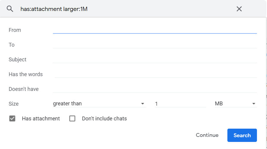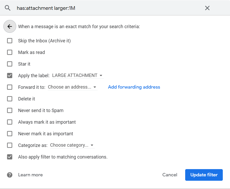 Label big emails: Eventually you will want to export your emails to your new email provider. Gmail has a generous amount of email storage, probably more than your other provider. To avoid using up all your storage, filter out big emails so you can manually export them, delete them, or ignore them in IMAP. Creating a filter is straight forward.
